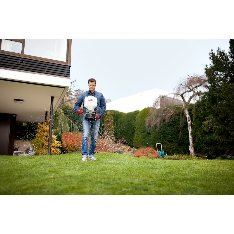 Con el esparcidor de granulado SOLO 421, los fertilizantes, la arena de invierno, las semillas, la cal granulada, el forraje silvestre, la arena seca del césped y muchos otros gránulos se pueden esparcir de manera extremadamente uniforme. Tiene una espalda de forma ergonómica y una cómoda correa de transporte ajustable. Esto significa que el esparcidor de granulado, que pesa solo 2,5 kg, se puede transportar cómodamente delante del cuerpo. Esto permite una amplia gama de usos, incluso en áreas intransitables o más empinadas.